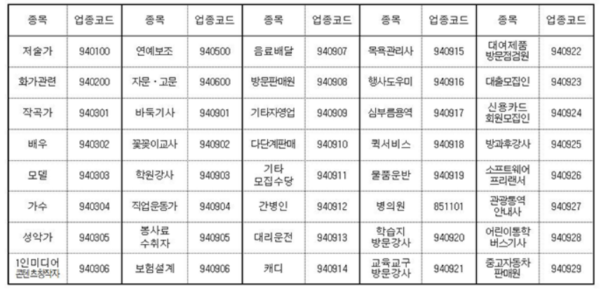 사업자가 아래 표와 같은 프리랜서(인적용역사업자)를 고용하고 소득을 지급한 경우 그 지급내용을 국세청에 제출하는 것을 사업소득 (간이) 지급명세서라고 합니다.