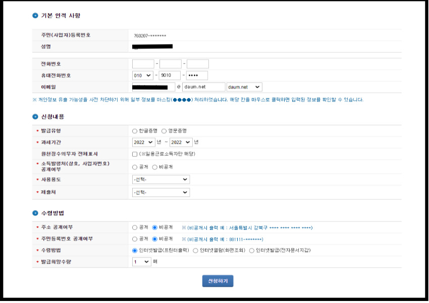 - 신청내용에서 한글 혹은 영문,과세기간,소득발생처 유무체크,사용용도선택,제출처선택